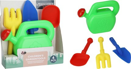 A szett tartalma: Öntözőkanna, gereblye, lapát, ásó